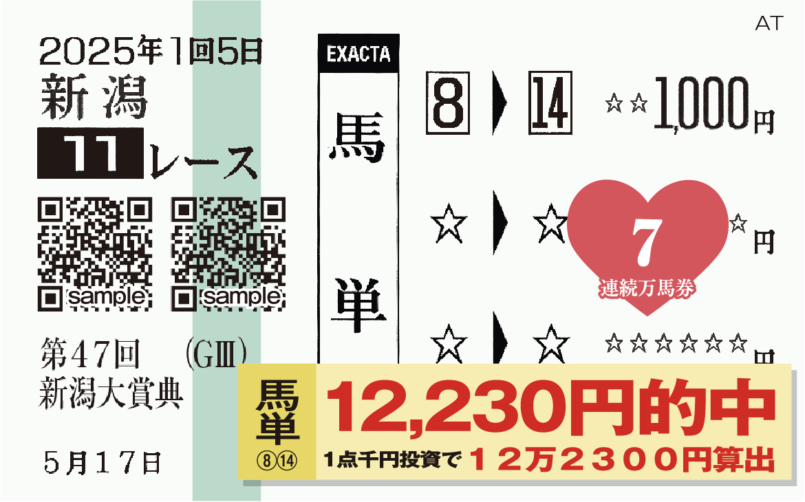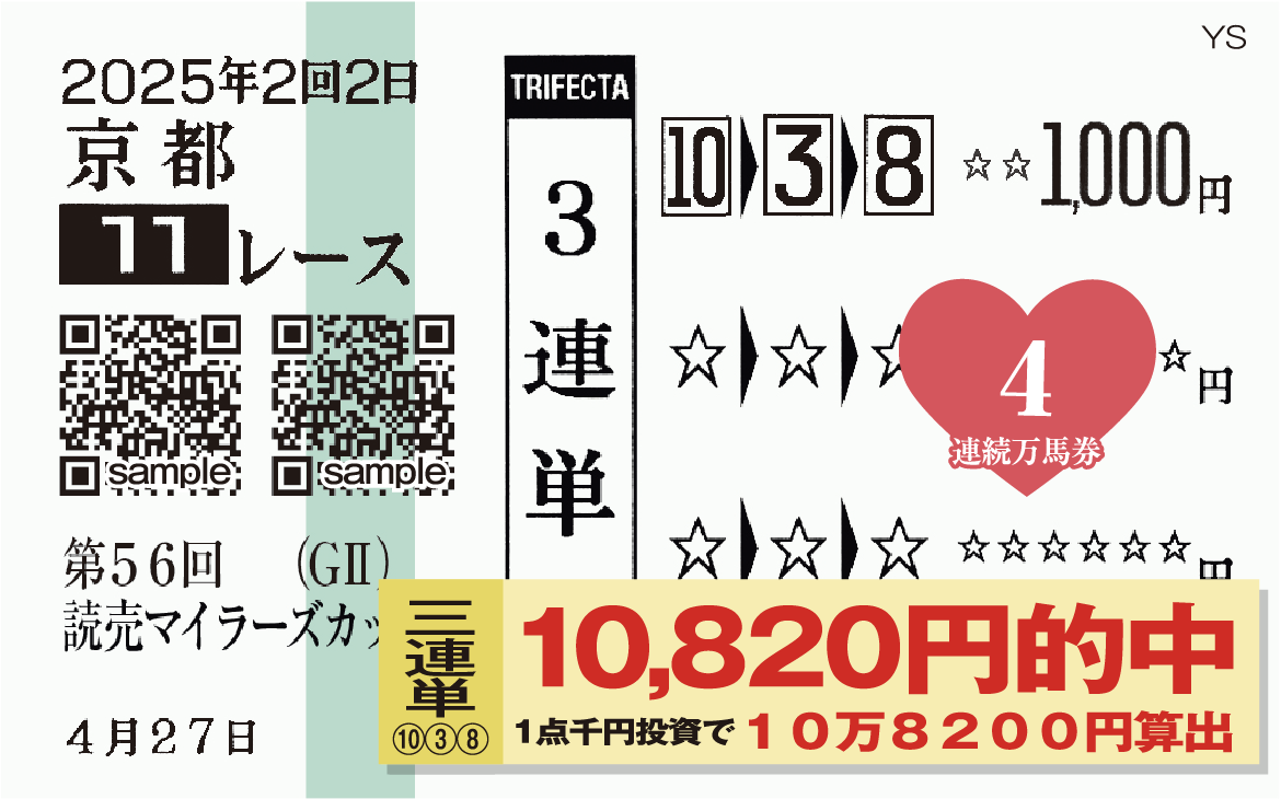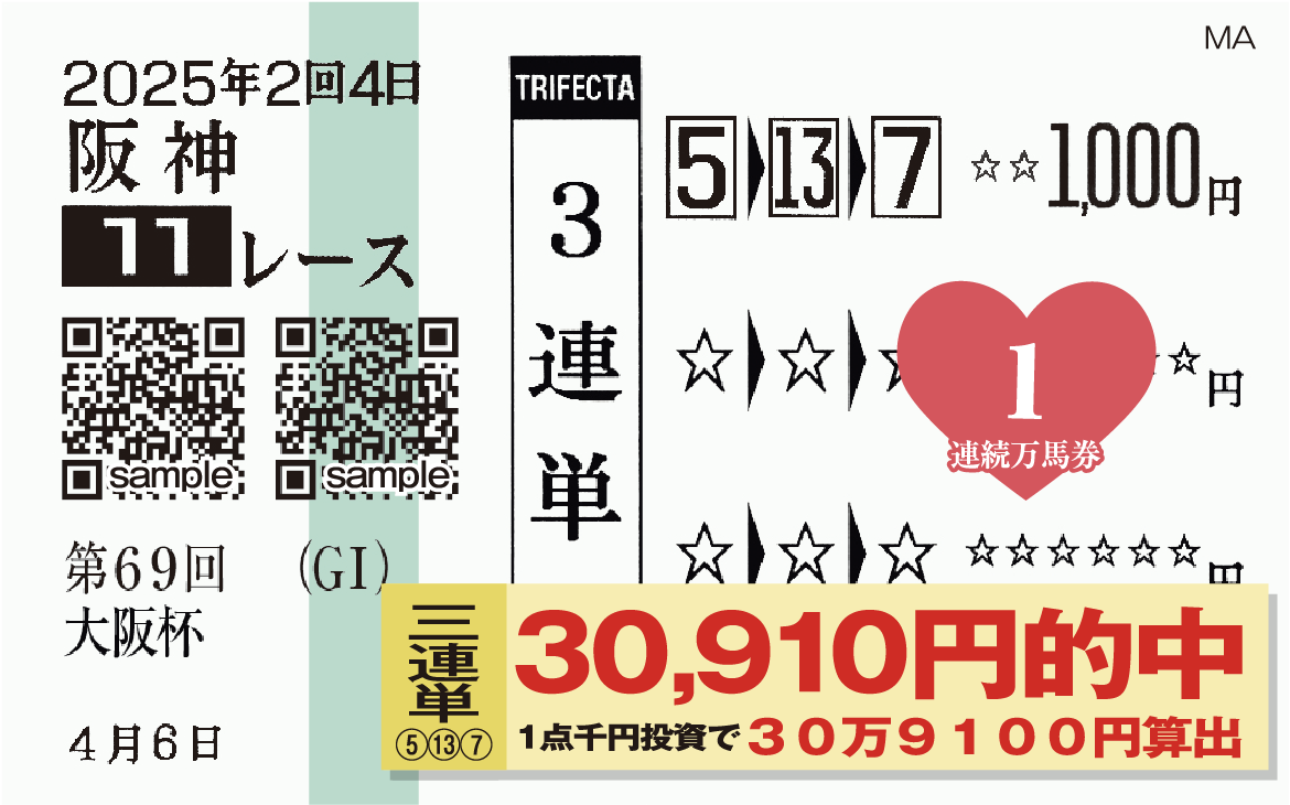 入会者様には、提供期間内13週13レース分の馬券プレゼントをご用意しております。馬券は1点1000円購入となり、配当は万馬券以上が見込まれるものもありますので、必ずご満足いただける払戻金をご獲得可能です。