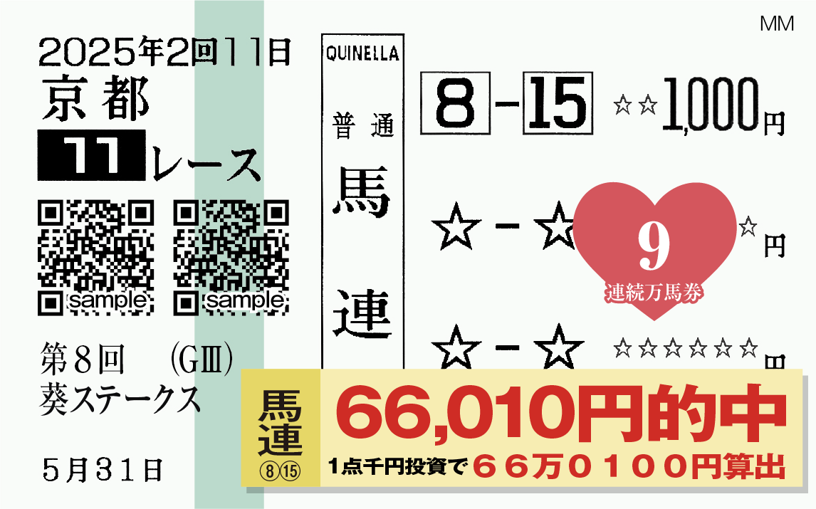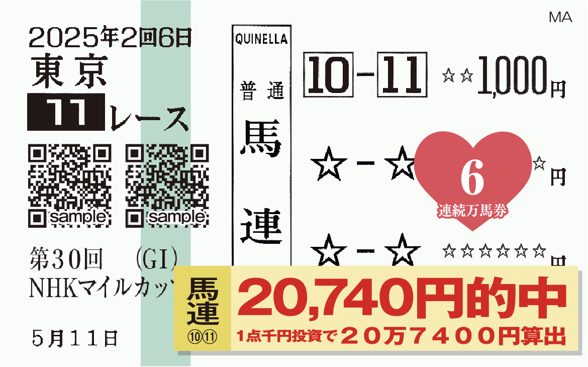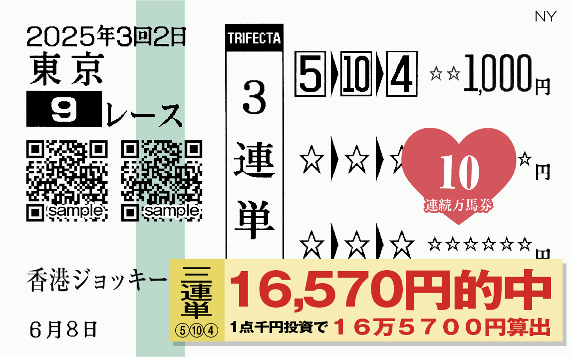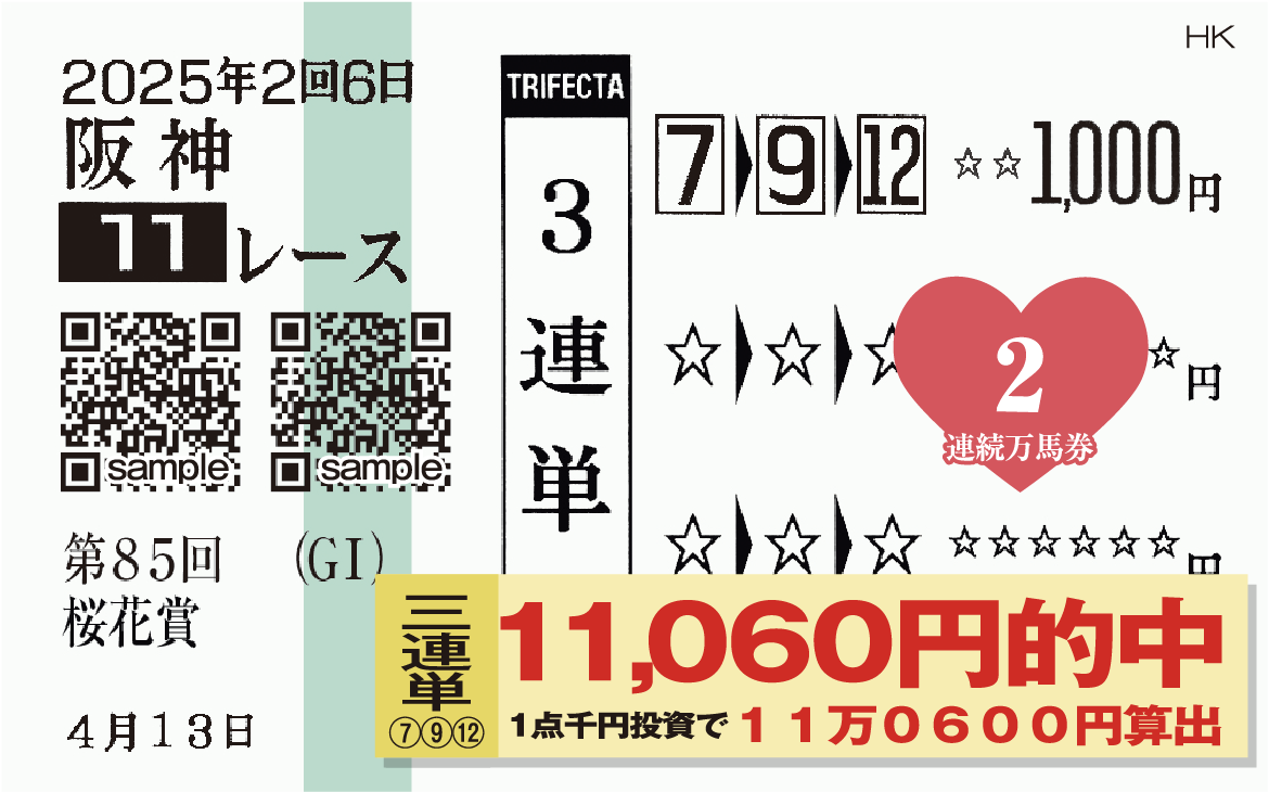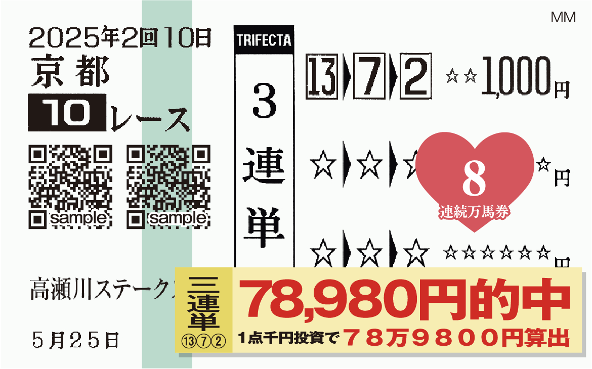 13レース分の送付馬券のうち、10レースは万馬券以上になるよう準備をしております。万が一万馬券10レース分が未達成だった場合は、さらに馬券付きの情報提供を延長(最大1ヶ月)させていただきます。